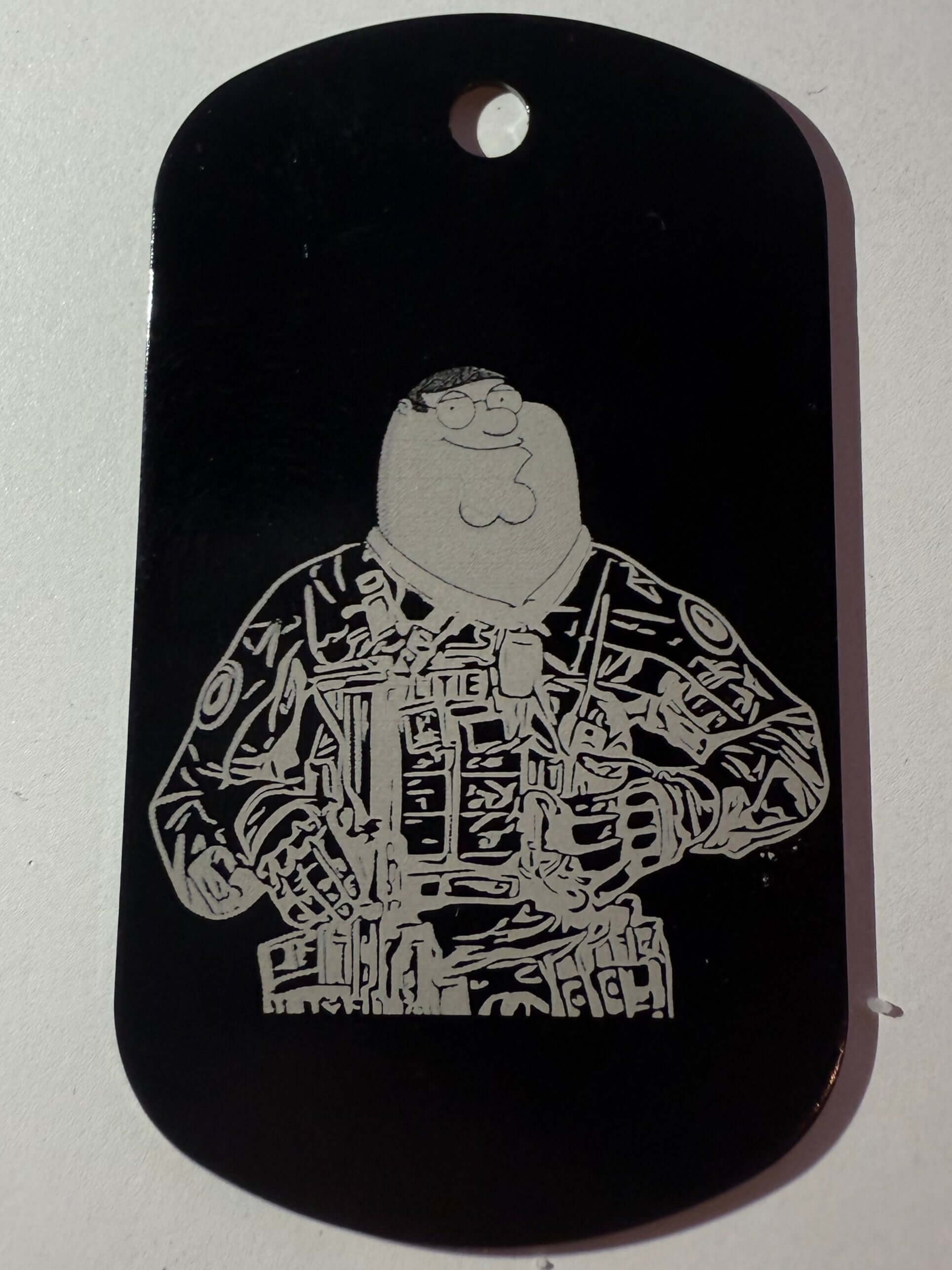 Design: Peter Griffin op het lichaam van een elite soldaat, met een gedetailleerde gravure