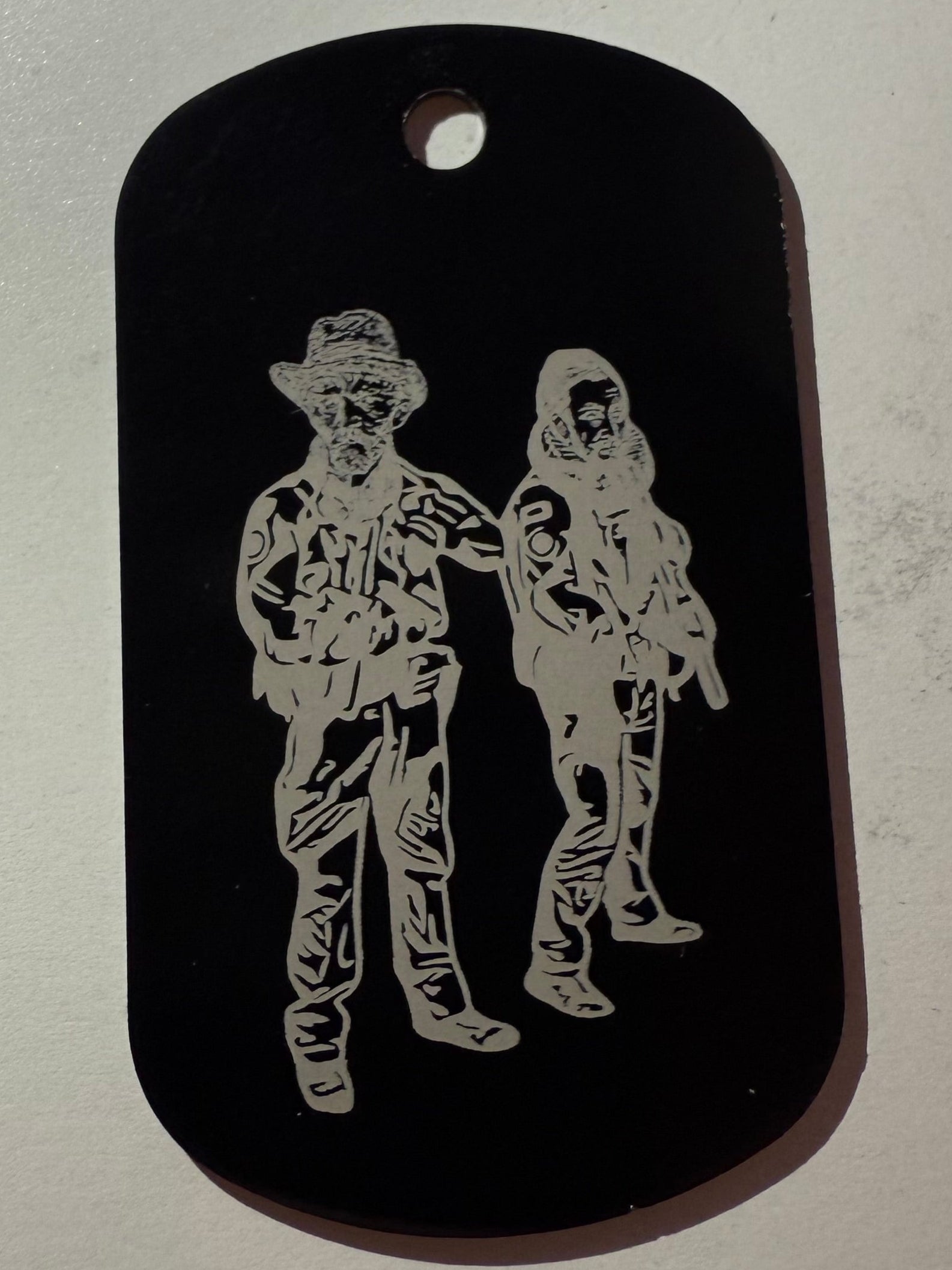 Met precisie gegraveerd op een zwart gecoate aluminium sleutelhanger, met een diode laser. Deze unieke uitvoering toont Van Gogh en Willem van Oranje als moderne operators ā klaar voor actie, met de blik vooruit en de erfenis van het verleden op hun schouders.